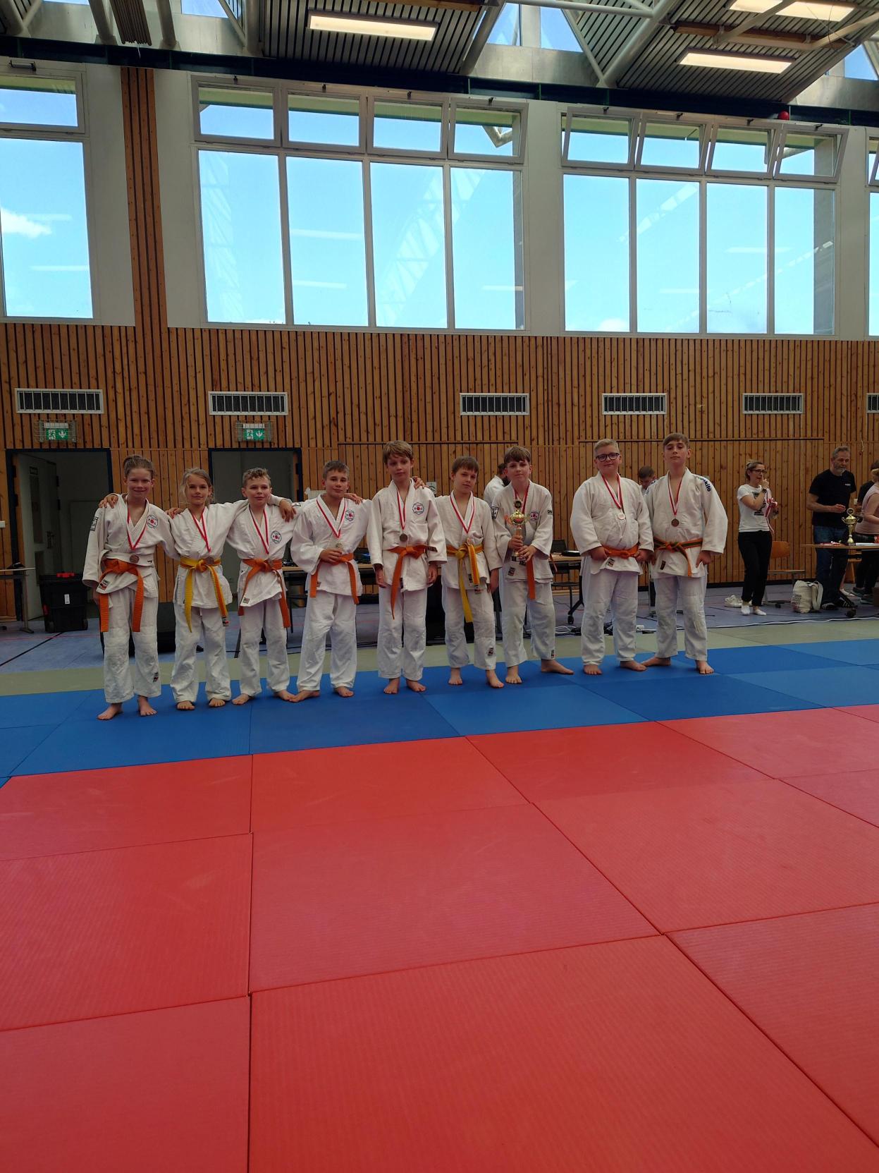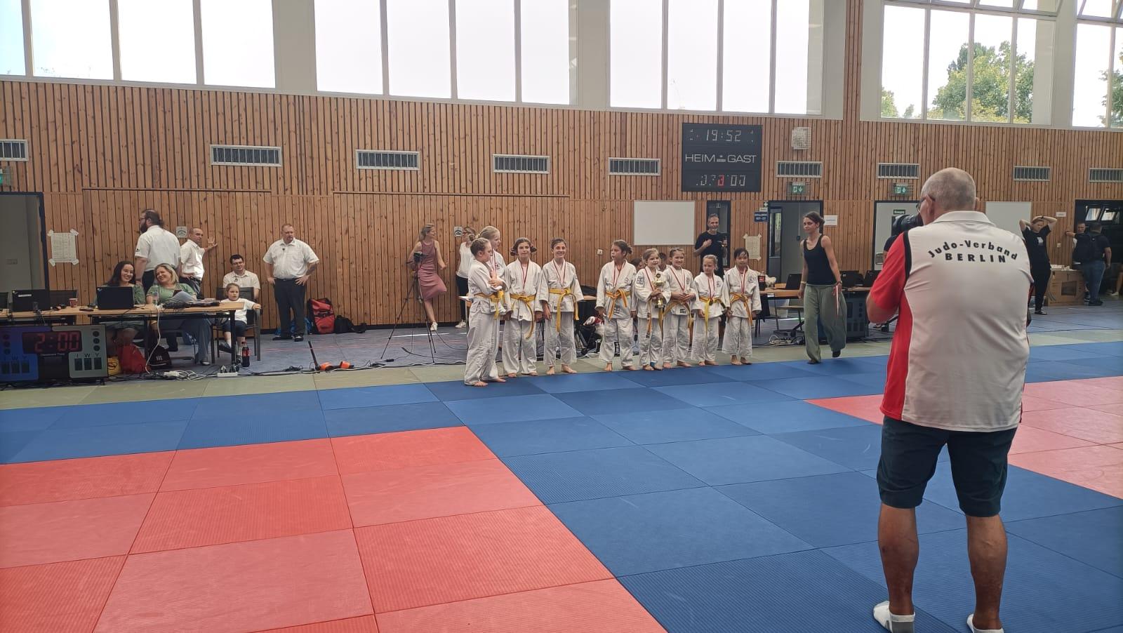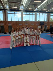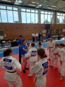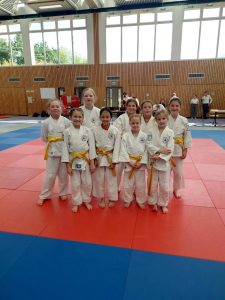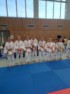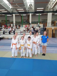 Unsere Mädchen zeigten guten Einsatz, mussten sich jedoch in allen drei Mannschaftskämpfen geschlagen geben. Im ersten Kampf haben wir knapp mit 2:3 gegen Kaizen Berlin verloren. Im zweiten Kampf mussten wir uns deutlich mit 1:4 gegen Shido Sha geschlagen geben. Im dritten Kampf, gegen den BC Randori, haben wir wieder knapp mit 2:3 verloren. Bei der Siegerehrung für den dritten Platz konnten unsere Mädels wieder lächeln.