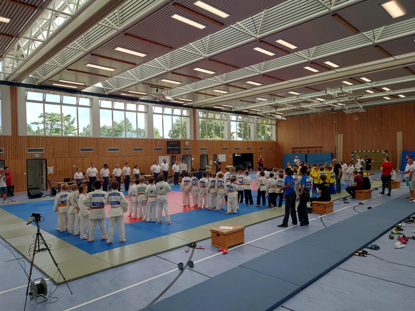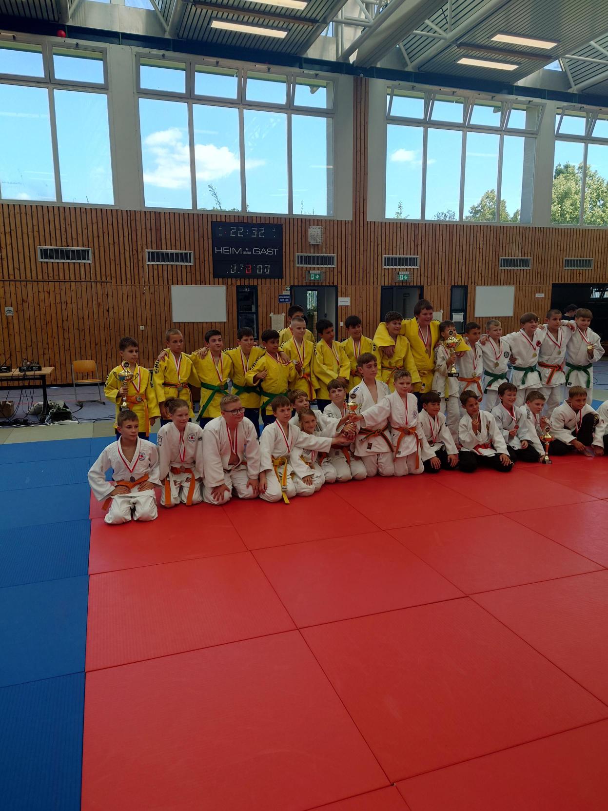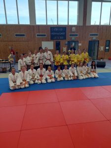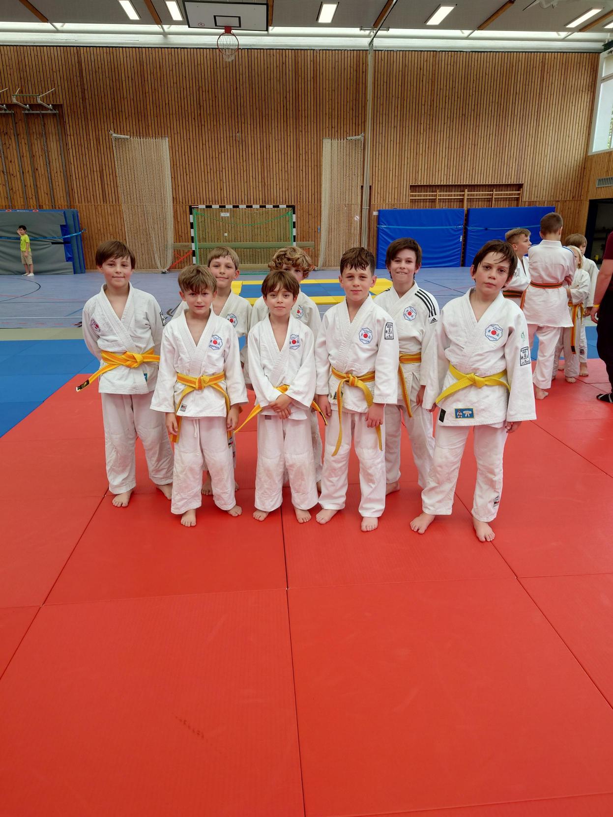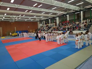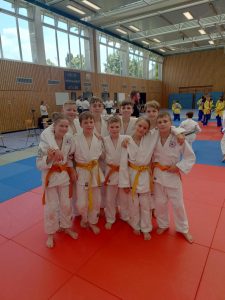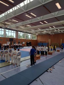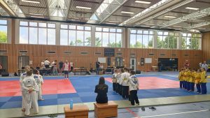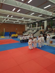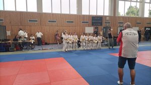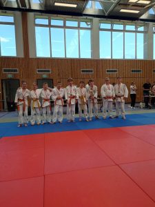 Nach den Mädchen folgten die Jungs. Für unsere Mannschaft gingen Felix, Karl, Hannes, Nils, Max, Marian, Emil, August und Johann Moritz an den Start. Leider konnten wir eine Gewichtsklasse nicht besetzen und lagen somit im ersten Kampf gegen die erste Mannschaft von Shido Sha bereits zu Beginn mit einem Punkt hinten. In den weiteren Kämpfen konnten wir nur einen weiteren Punkt holen und verloren schließlich mit 1:5.